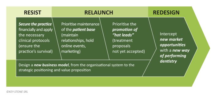За да можем да оцелеем незасегнати през тази първа фаза, трябва да започнем да мислим за 2022 г. Докато настоящата година е загубена от икономическа гледна точка, ние трябва да започнем с планирането на бъдещето. Идната година също ще бъде предизвикателна, защото най-вероятно ще продължат изискванията за физическо дистанциране и стриктните протоколи за безопасност при работа с пациенти. Икономическата и социалната криза също вероятно ще се проточат още дълго. Въпреки това налице е отлична възможност за възобновяване на отличните и успешни дентални практики, които да са конкурентоспособни и разчитащи на доверието на пациентелата си. Всеки един от нас трябва да има тази ясна визия за бъдещето и да се опита да я постигне със самочувствие и вяра.