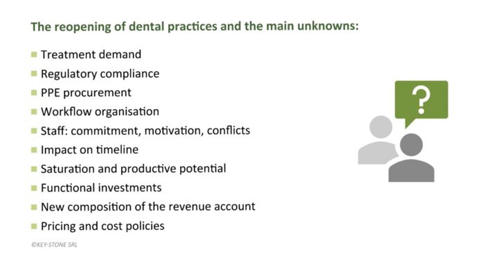 Друг важен момент е отварянето на практиката. Когато кабинетът/клиниката е готов да приеме отново пациенти, е уместно това да се съобщи публично и по този начин да се насърчат посещенията. Що се отнася до този аспект, освен приходите, които са били замразени по време на карантината, е важно да се има предвид, че през този период не са постъпили нови пациенти и съответно не са били предлагани нови лечебни планове. Този проблем ще бъде усетен през идните месеци и дори през есента. Поради този факт е абсолютно наложително практиките да създадат възможност за приемане на нови пациенти, въпреки че вероятно са затрупани от работа поради всички отложени и чакащи лечения.