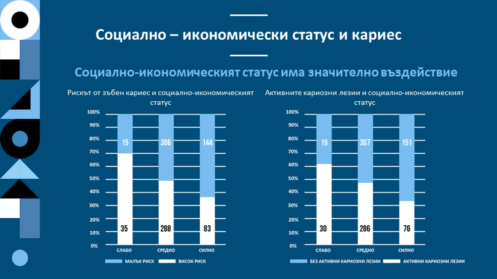 Фиг. 2: Свързване на социално-икономическия статус на пациентите с рискa от кариес и наличието на кариозни лезии.