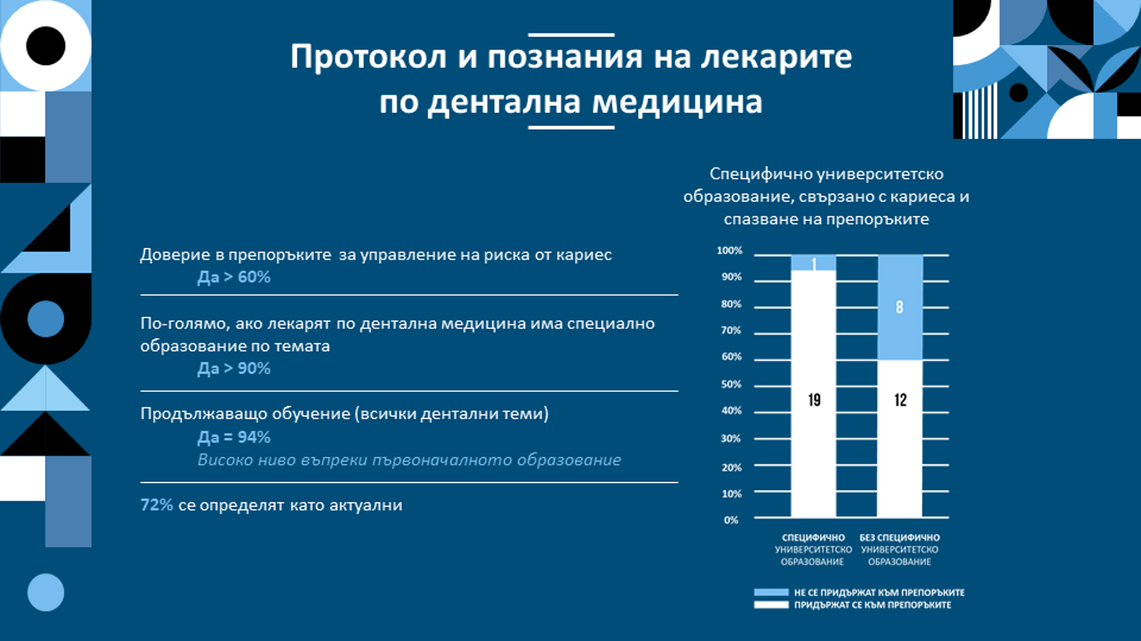 Петдесет и един лекари по дентална медицина се съгласиха да вземат участие в изследването (19 в България, 8 в Гърция, 14 в Полша и 10 в Португалия), със средна възраст 44 години (± 12), средно 19 години практика и женско мнозинство (63%). Повечето са специалисти в дадена област: детска дентална медицина (15,7%), орална хирургия (15,7%), възстановителна дентална медицина, ендодонтия (15,7%), докато общата дентална медицина представлява 13,7%. Като цяло 48% от изследователите са получили специално обучение за управление на риска от кариес в университета, въпреки че има известни различия между държавите: 78,6% в Полша, 60% в Португалия, 28,6% в Гърция и 26,3% в България. Почти всички лекари по дентална медицина съобщават, че са предприели следдипломно дентално обучение, но само 72% се описват с познания, съобразени със съвременните изисквания.