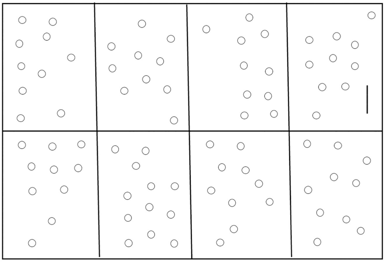 Всички участващи зъболекари преминаха през 6-часов теоретичен и практически курс за базисни умения при работа с конвенционален и 3D микроскоп. Обучението бе проведено от втора година специализанти по ендодонтия от Universidad Nacional Pedro Henriquez Ureña в Санто Доминго, Доминиканска република. След обучението участниците преминаха тестове за сръчност и фина моторика. Тестове се състояха в това с 21 мм #10 K-пила точно да уцелят поредица от кръгли мишени с диаметър части от милиметъра. Мишените бяха принтирани на #20 калибрирани хартиени листа с осем отделения, във всяко от които има по десет от тези кръгчета (фиг. 3). Четири от отделенията съдържаха мишени с диаметър 0.3 мм, а в останалите четири мишените бяха с диаметър 0.35 мм с формата на буквата „О“, калибрирана респективно в размери 2 и 2.5. Позицията на всяка мишена в рамките на полето бе определена на случаен принцип от генератор на случайни числа Microsoft Excel.